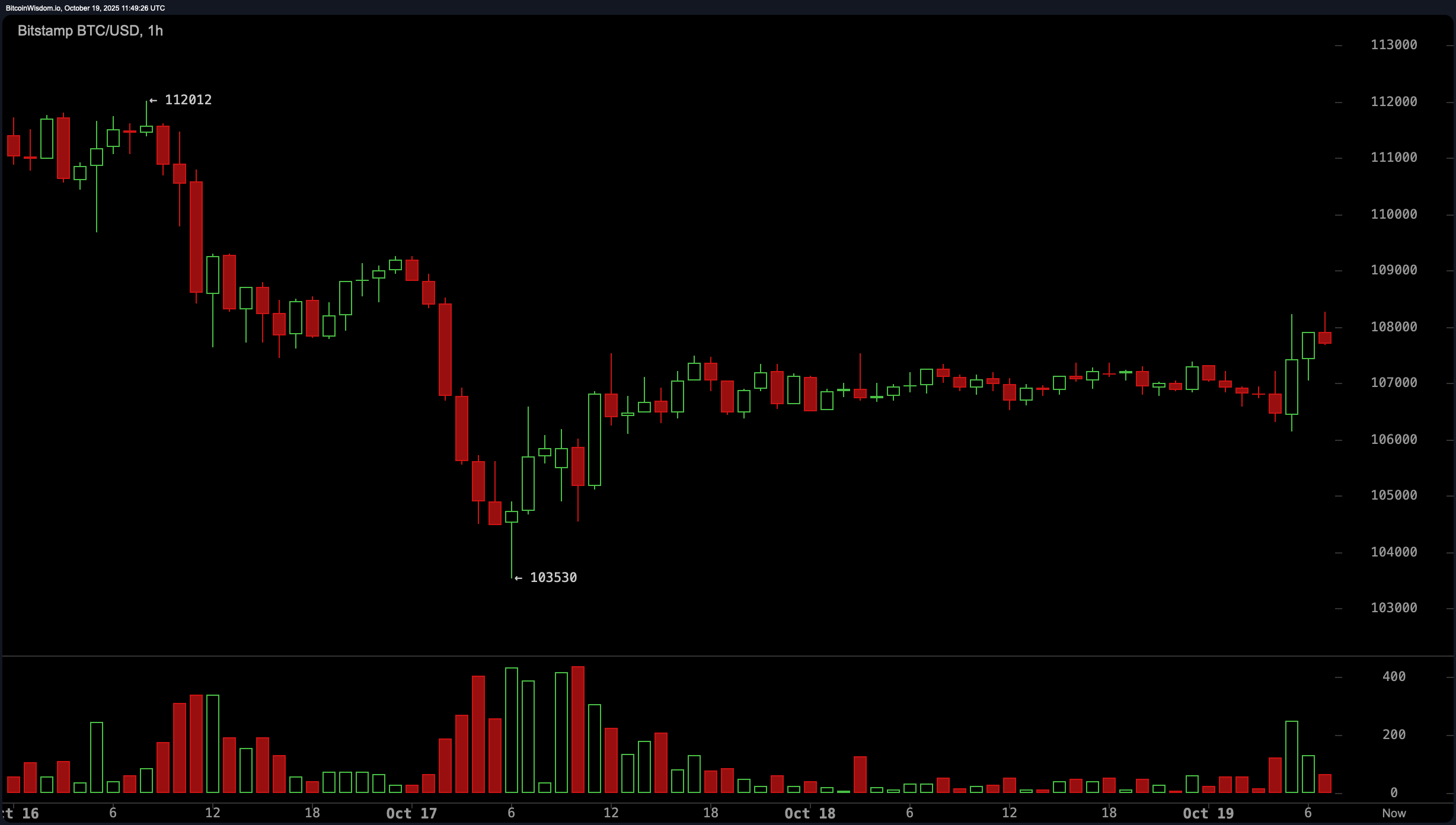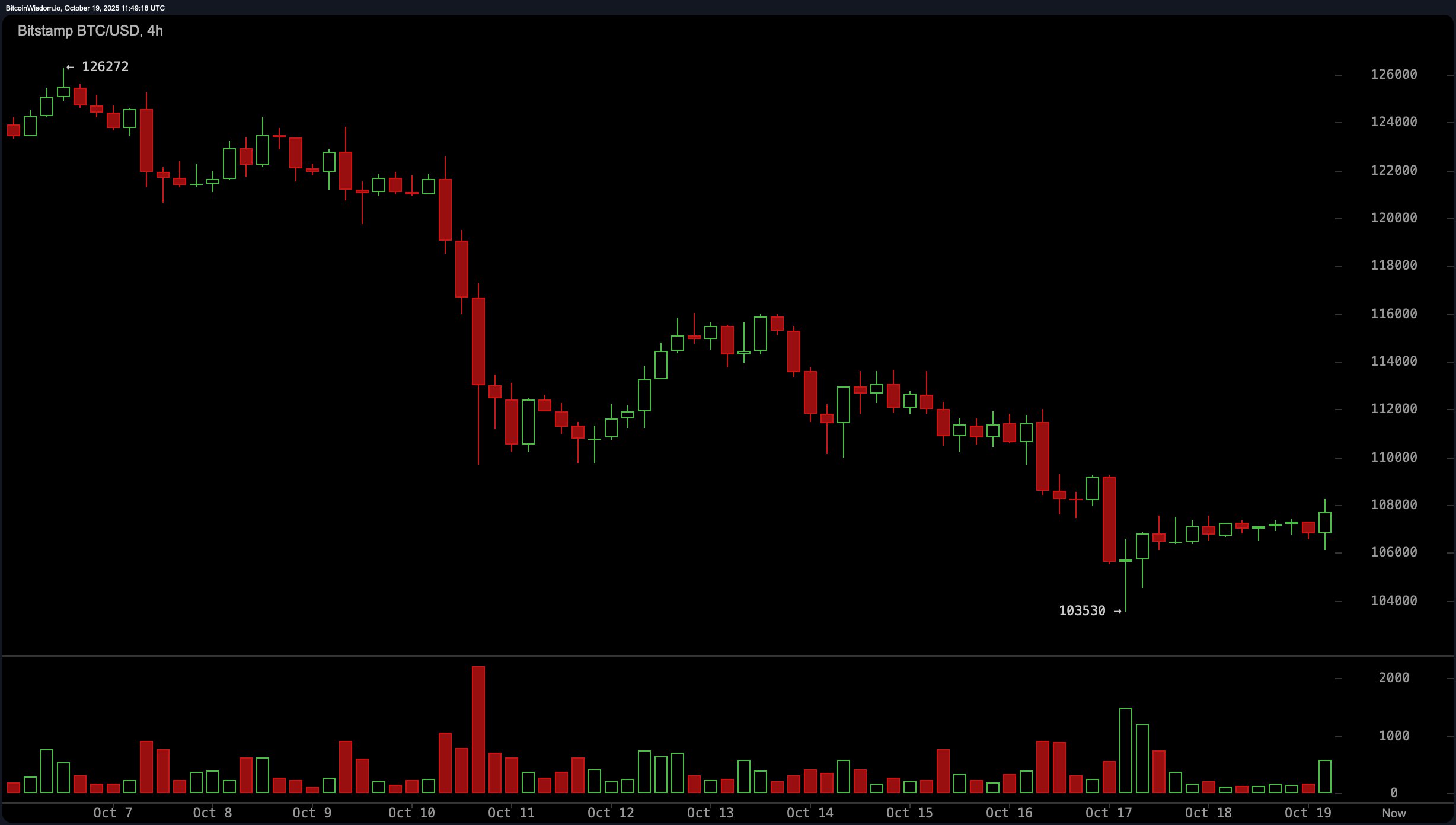 Дневной график рисует драматическую дугу. После пика около $126 272 в начале октября, bitcoin резко упал до $103 530, сократившись почти на 18% за несколько дней. Эта агрессивная коррекция не прошла незамеченно – объём резко возрос на минимумах, намекая на вспышку панических продаж, как будто трейдеры коллективно забыли, как пишется слово «терпение». Недавние свечи ведут себя застенчиво, показывая небольшие тела и нерешительность. Перевод: медведи устали, а быки выглядывают из-за занавесок, бормоча: «Работает ли это?» Индикаторы импульса и товарного канала (CCI) оба указывают на потенциал отскока, при этом импульс составляет -13 883, а CCI – -109. Бычье расхождение? Скорее, бычье «давайте притворимся, что нам не страшно».